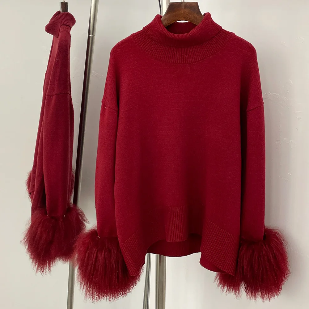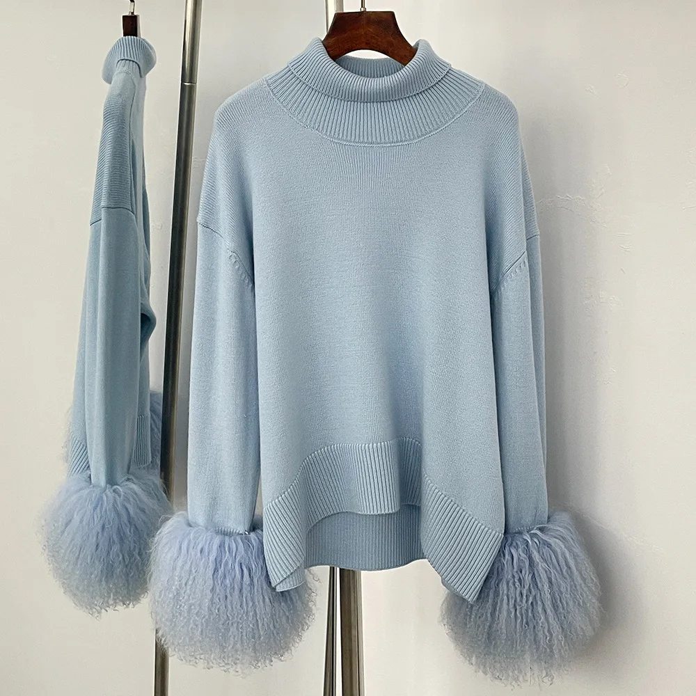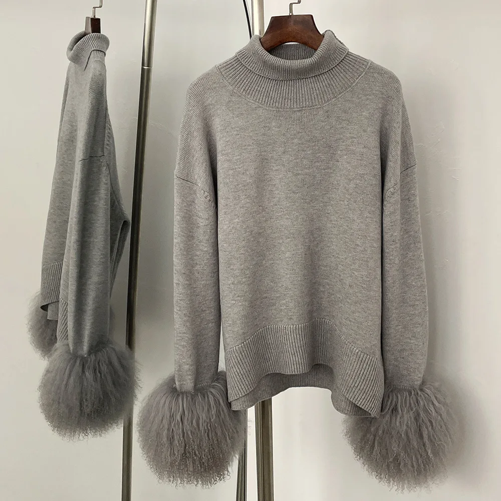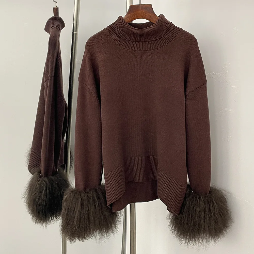 ZMEENNA Women's Elegant High Neck Knit Sweater With Luxurious Faux Fur Cuffs Cozy Long Sleeve Chic Winter Warmth ZM3417
